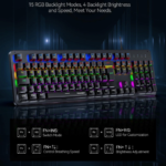 TECKNET mechaninė žaidimų klaviatūra, 15 RGB foniniu apšvietimu pasižyminti mechaninė laidinė klaviatūra, 105 viso dydžio klavišai su mėlynu jungikliu. Žaidimų klaviatūros, skirtos kompiuteriams, „Windows“, „Mac“